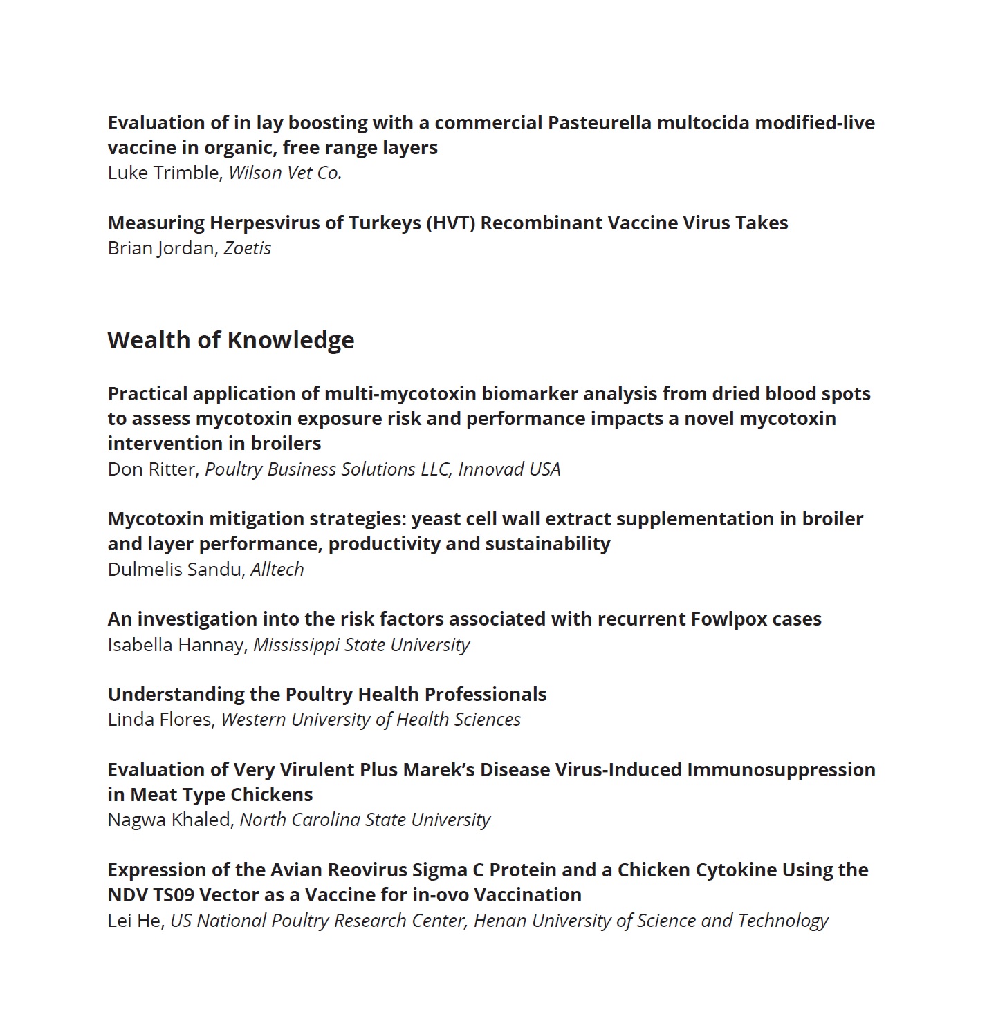 - "An investigation into the risk factors associated with recurrent Fowlpox cases." American Association of Avian Pathologists 2025 Annual Meeting, American Association of Avian Pathologists, Portland, Oregon. 2025